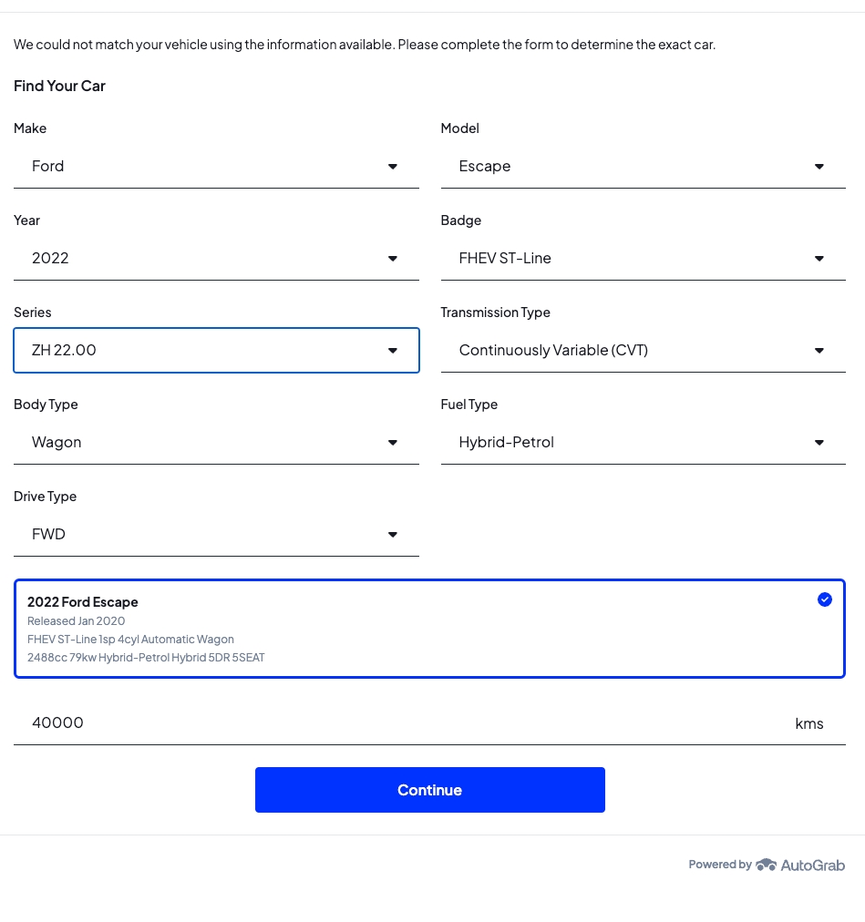 If no vehicle description and odo are provided, the overlay will prompt the user to select a vehicle manually from a set of dropdowns.