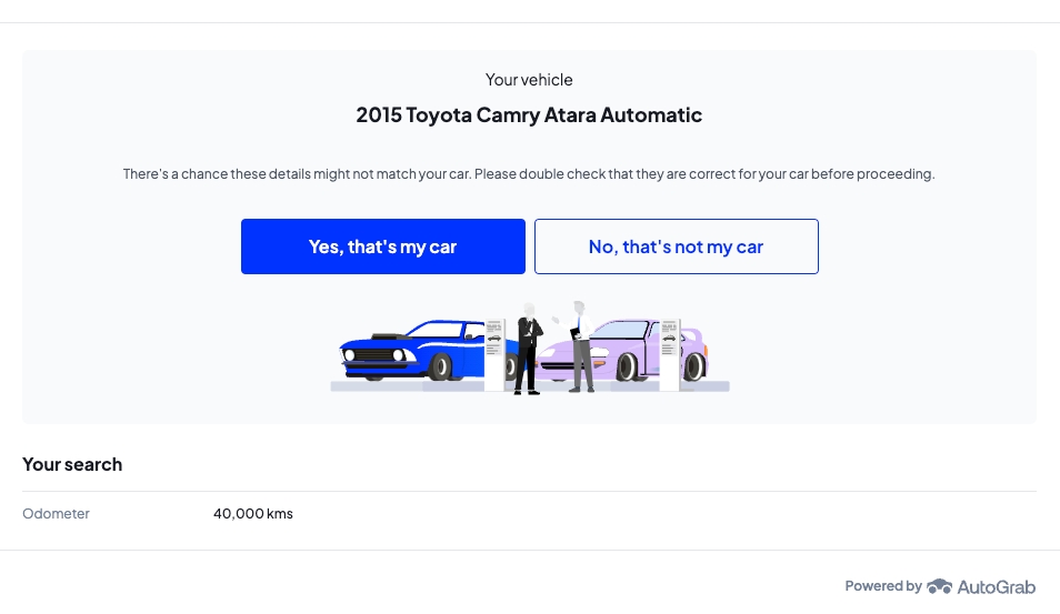By providing a stringified vehicle description, AutoGrab will automatically match the vehicle based on the description and value based on the odometer provided when triggering the overlay widget. If the vehicle is incorrect, the user can override it.