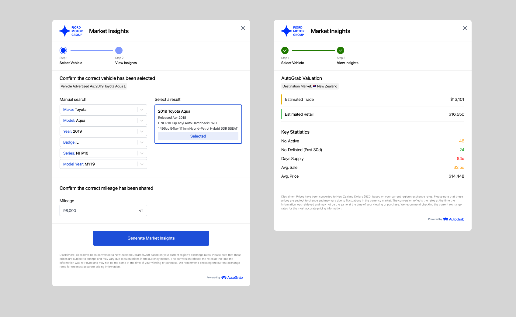The widget can show regionalised market insights based on input vehicles. It is customisable to your brand via a hero brand icon. The resulting market information can help your customers understand the market reception to a given vehicle.