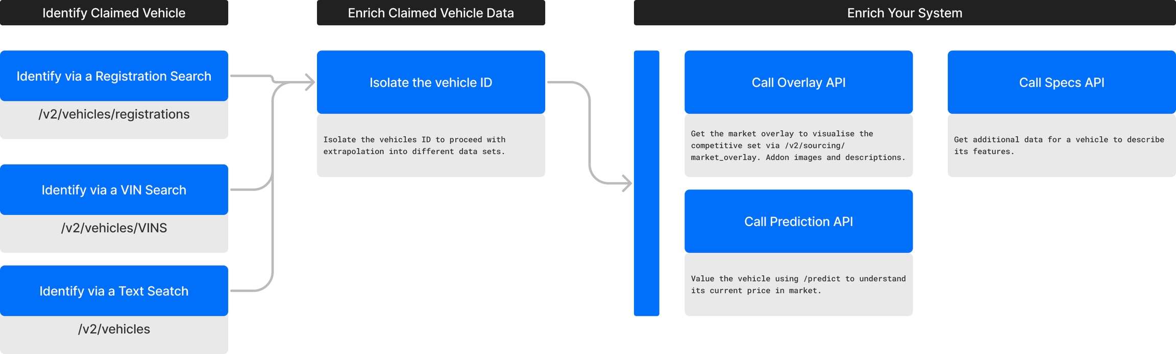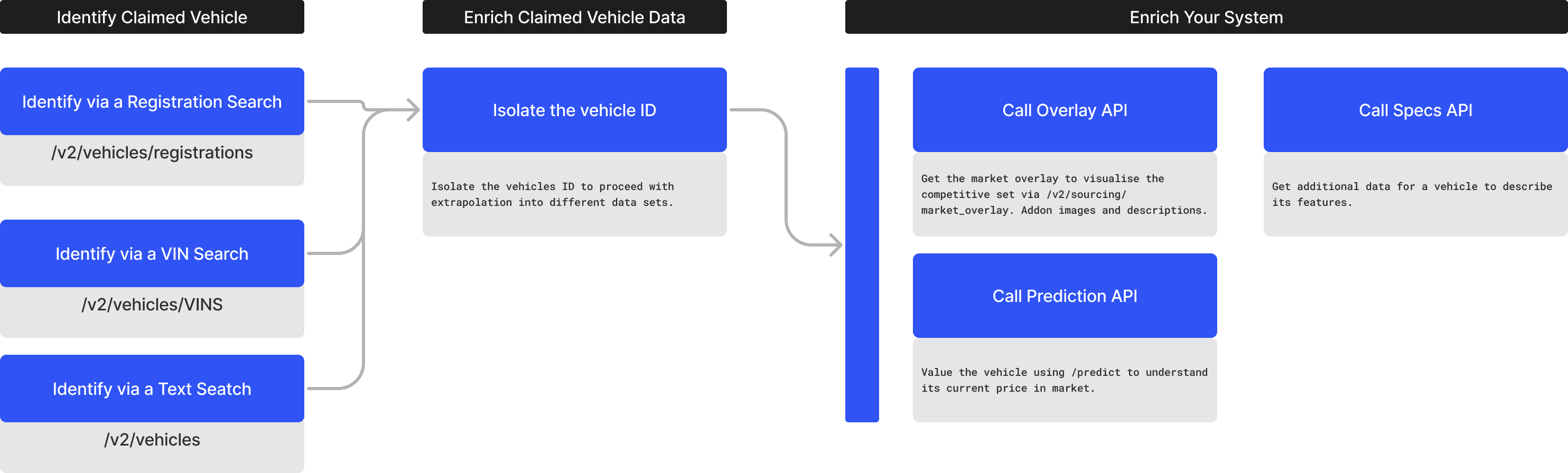 To begin the journey you will need to convert a real-world identifier into a vehicle ID to progress through the wider set of data. You can do this in four common ways;